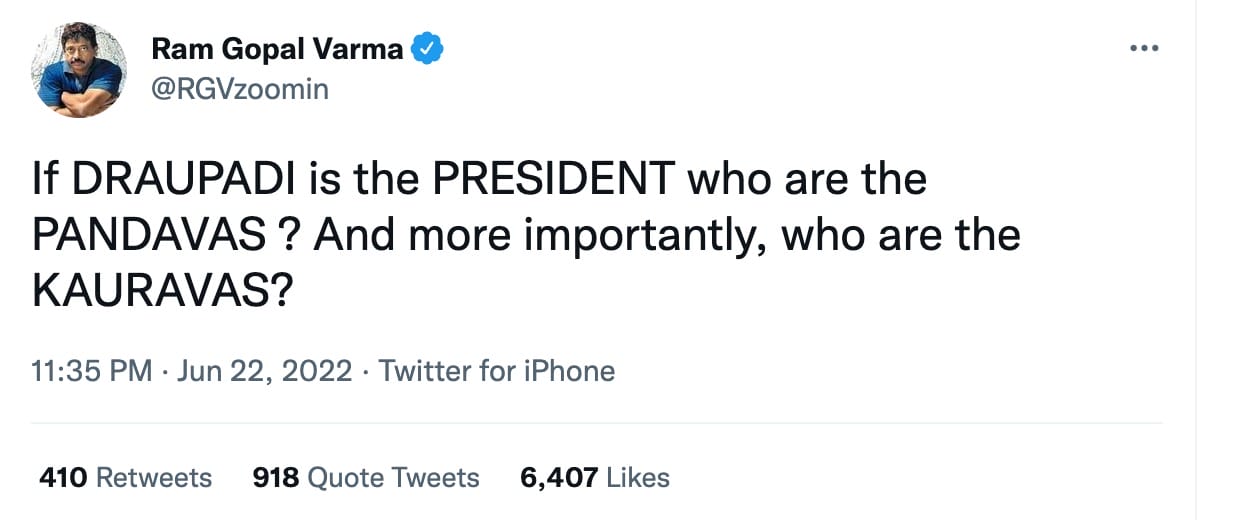 रामगोपाल वर्मा ने ट्वीट में पूछा कि ‘अगर द्रौपदी राष्ट्रपति हैं, तो पांडव कौन हैं, और इससे भी महत्वपूर्ण बात यह है कि कौरव कौन हैं?’ वहीं बीजेपी नेता गुडूर नारायण रेड्डी ने इसको लेकर शिकायत दर्ज करवाते हुए कहा कि यह ट्वीट एससी-एसटी लोगों का अपमान करने के समान है, हमने पुलिस से कड़ी कार्रवाई करने का अनुरोध किया। उन्होंने कहा, अगर उन्होंने सिर्फ द्रौपदी, पांडवों और कौरवों का जिक्र किया होता, तो हमें कोई आपत्ति नहीं होती। लेकिन बीजेपी कार्यकर्ता होने के नाते हम राम गोपाल वर्मा की ऐसी टिप्पणियों से आहत हैं, क्योंकि द्रौपदी मुर्मू एनडीए की राष्ट्रपति पद की उम्मीदवार हैं।