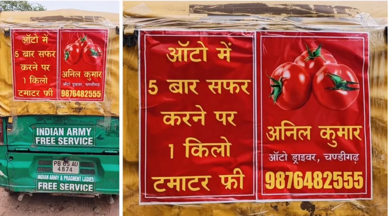 चंडीगढ़ के एक ऑटो ड्राइवर ने दिलचस्प स्कीम शुरू की है। उन्होने ऑफर दिया है कि अगर आप उनके ऑटो में पांच बार उनके ऑटो सफर करेंगे तो आपको एक किलो टमाटर फ्री मिलेंगे। ड्राइवर अनिल कुमार ने अपने ऑटो में बाकायदा इसका एक पोस्टर लगाया है। वे स्थानीय ऑटो यूनियन के प्रधान भी हैं और इस स्कीम के बाद अब सुर्खियों में है। इतना ही नहीं, उन्होने ये भी कहा है कि उनके ऑटो में सेना के जवान और गर्भवती महिलाएं मुफ्त में सफर कर सकती हैं। बता दें कि इससे पहले पंजाब के गुरदासपुर में जूते बेचने वाली एक दुकान पर स्कीम निकाली गई थी कि 1500 से 2000 तक के जूते खरीदने पर 2 किलो टमाटर मुफ्त मिलेंगे। ऐसे ही ऑफर कुछ पार्लर में भी निकाले गए थे।