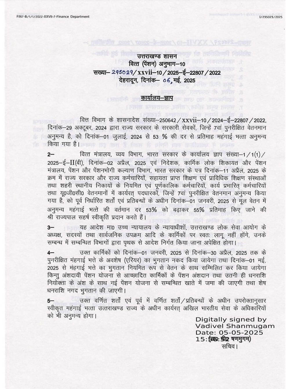 Uttarakhand Employees DA Hike : उत्तराखंड के सरकारी कर्मचारियों और पेंशनरों के लिए खुशखबरी है। सीएम पुष्कर सिंह धामी की घोषणा के बाद अब वित्त विभाग ने महंगाई भत्ता/ महंगाई राहत में वृद्धि के आदेश जारी कर दिए है।आदेश के मुताबिक अब कर्मचारियों पेंशनरों को केन्द्र के समान 55 प्रतिशत की डीए/डीआर का भुगतान किया जाएगा।