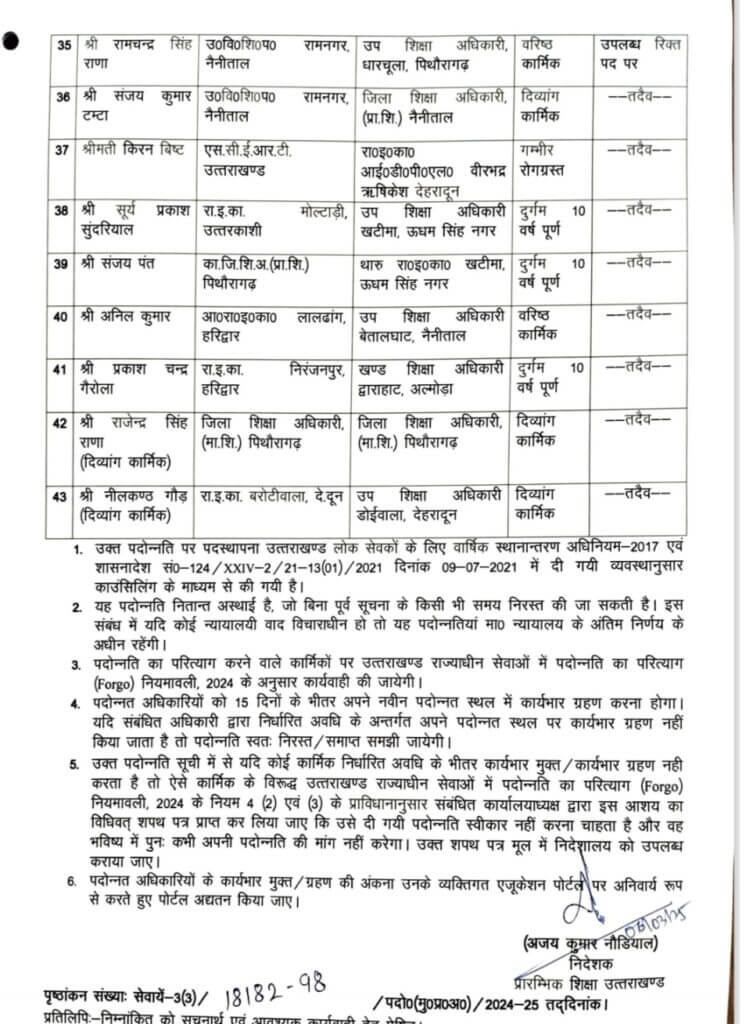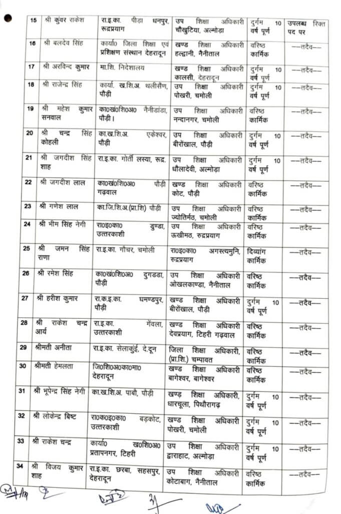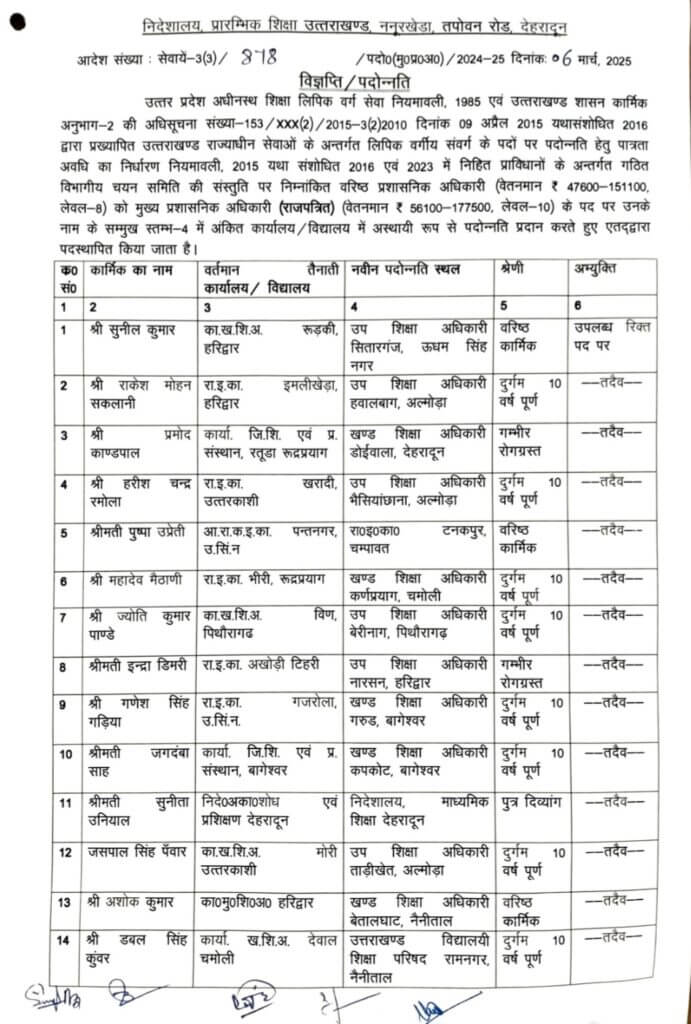 - शिक्षा विभाग में मुख्य प्रशासनिक अधिकारी के पद पर सुनील कुमार, राकेश मोहन सकलानी, प्रमोद काण्डपाल, हरीश चंद्र रमोला, पुष्पा उप्रेती, महादेव मैठाणी, ज्योति कुमार पांडे, इंद्रा डिमरी, गणेश सिंह गड़िया, जगदंबा शाह, सुनीता उनियाल सहित 43 लोगों को पदोन्नति मिली है।