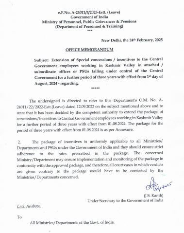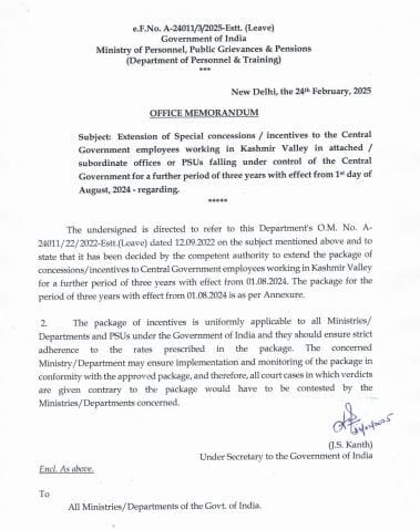 कार्मिक मंत्रालय के आदेश के मुताबिक, सक्षम प्राधिकारी की ओर से कश्मीर घाटी में काम करने वाले केंद्र सरकार के कर्मचारियों के लिए रियायतों/प्रोत्साहनों के पैकेज को 1 अगस्त 2024 से 3 साल (2027) की अवधि के लिए बढ़ाया गया है।यह राहत सभी केंद्रीय मंत्रालयों, विभागों और सार्वजनिक क्षेत्र के उपक्रमों (PSU) के कर्मचारियों पर लागू होगी।