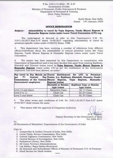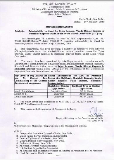 DoPT की ओर से जारी आदेश के मुताबिक, मौजूदा राजधानी, शताब्दी और दुरंतो ट्रेनों के अलावा सरकारी कर्मचारी पात्रता के अनुसार एलटीसी के तहत तेजस एक्सप्रेस, वंदे भारत एक्सप्रेस और हमसफर एक्सप्रेस ट्रेनों में यात्रा कर सकेंगे।विभाग ने बताया कि यह कदम एक्सपेंडिचर डिपार्टमेंट से सलाह लेने के बाद उठाया गया है।