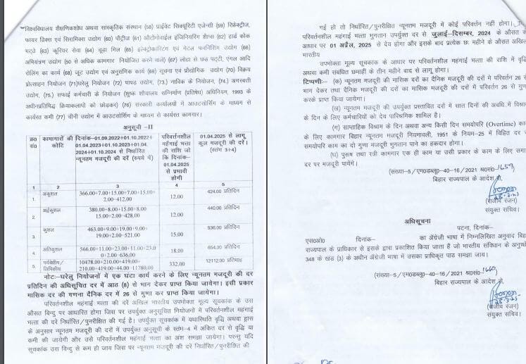 बिहार सरकार ने न्यूनतम मजदूरी अधिनियम 1948 के अंतर्गत सभी अनुसूचित नियोजनों में कार्य करने वाले श्रमिकों की न्यूनतम मजदूरी में 3.17 प्रतिशत अतिरिक्त परिर्वतनशील महंगाई भत्ता की वृद्धि की है। अकुशल, अर्द्धकुशल, कुशल और अतिकुशल श्रमिक के आधार पर 4 श्रेणी रखी हैं। प्रत्येक श्रेणी के श्रमिक की न्यूनतम मजदूरी में 12 रुपये की वृद्धि हुई है।हालांकि कृषि श्रमिकों को छोड़कर बाकी सभी 89 नियोजनों में न्यूनतम मजदूरी दरें एक समान होंगी।