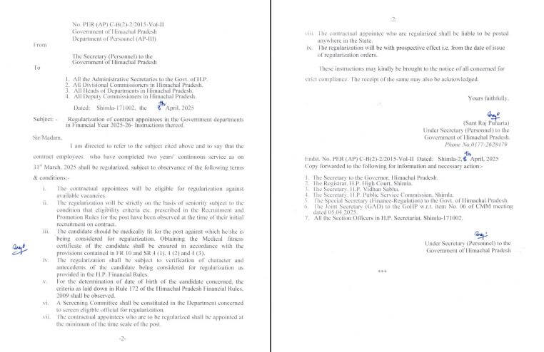 दरअसल, 5 अप्रैल शनिवार को सीएम सुखविंद्रर सिंह सुक्खू की अध्यक्षता में हुई कैबिनेट बैठक में 31 मार्च 2025 तक 2 वर्ष का कार्यकाल पूरा कर चुके अनुबंध कर्मियों की सेवाओं को नियमित करने का निर्णय था। 4 वर्ष की निरंतर सेवा पूरी कर चुके दैनिक वेतनभोगी और आकस्मिक भुगतान कर्मियों को भी इसी तिथि से नियमित करने का भी निर्णय लिया था, जिसके बाद अब कार्मिक विभाग हिमाचल द्वारा आदेश जारी किए गए है। पूर्व में 2 साल का कॉन्ट्रैक्ट पीरियड पूरा करने वाले अनुबंध कर्मियों को 31 मार्च व 30 सितंबर को रेगुलर किया जाता था ।