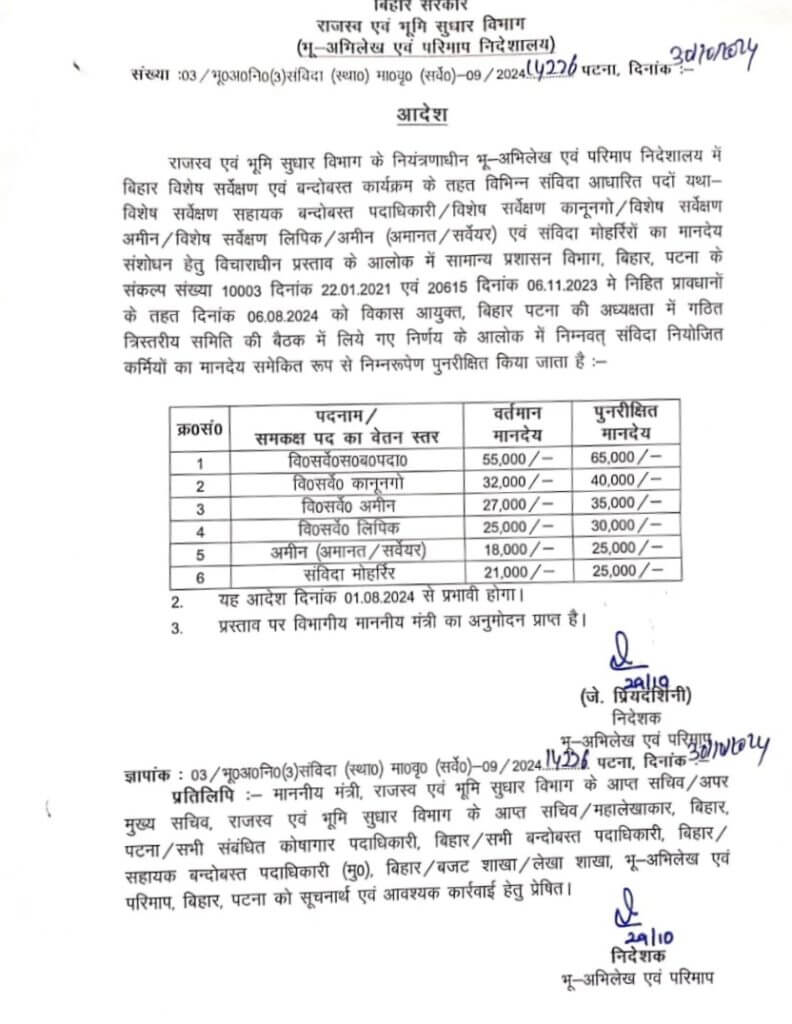बिहार सरकार ने भूमि सुधार एवं राजस्व विभाग में संविदा कर्मियों को बड़ा तोहफा देते हुए मानदेय में वृद्धि की है, इससे कर्मचारियों की सैलरी में 4000 से 10,000 की वृद्धि होगी।इससे 13 हजार से अधिक संविदा कर्मियों और अधिकारियों को फायदा होगा। मानदेय में यह बढ़ोतरी 1 अगस्त 2024 से लागू होगी, ऐसे में अगस्त सितंबर और अक्टूबर महीने का अतिरिक्त मानदेय वेतन भी कर्मियों को दिया जाएगा।यह लाभ नए तथा पुराने सभी कर्मचारियों को मिलेगा। इससे सरकारी खजाने पर 192 करोड़ रुपए का अतिरिक्त बोझ पड़ेगा।