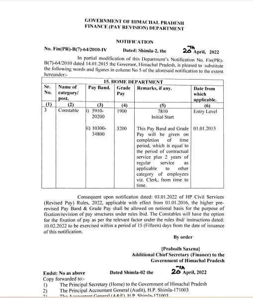 हिमाचल की जयराम सरकार (Jairam Thakur) ने पुलिस कर्मियों को 10 फरवरी 2022 को जारी सिविल सर्विस रूल्स के प्रावधानों के तहत संशोधित वेतन देने का निर्णय लिया है। पुलिस कांस्टेबलों को पे बैंड व ग्रेड पे (Police Constables Pay Band and Grade Pay) दो साल अनुबंध पर रहने के साथ दो साल का नियमित सेवाकाल पूरा करने पर दिया जाएगा।इसके बाद वेतन निर्धारण के लिए पुलिस कर्मियों को भी 15 दिनों में विकल्प देने को कहा गया है।नई अधिसूचना के तहत लाभार्थी पुलिसकर्मियों का एंट्री लेवल 1 जनवरी 2015 से तय किया गया है।