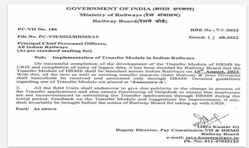 आदेशानुसार, रेलवे बोर्ड (Railway Board) ने 13 लाख कर्मचारियों के लिए नई स्थानांतरण पॉलिसी तैयार की गई है, इसके तहत अब कर्मचारी अपने घर के आसपास ट्रांसफर आसनी से ले सकेगा। इसके लिए रेल मंत्रालय ने ट्रांसफर माड्यूल लागू किया है, इसके तहत रेलवे के सॉफ्टवेयर बनाने वाले संगठन सेंटर फोर रेलवे इंफोर्मेशन सिस्टम (CRIS) ने कर्मचारियों के प्रबंधन के लिए एक अहम माड्यूल तैयार किया है,जिसे एचआरएमएस (NRMS) नाम दिया गया है। इसका सफल परीक्षण होने के बाद रेलवे बोर्ड ने 15 अगस्त से पूरे देश में लागू करने का फैसला किया है।