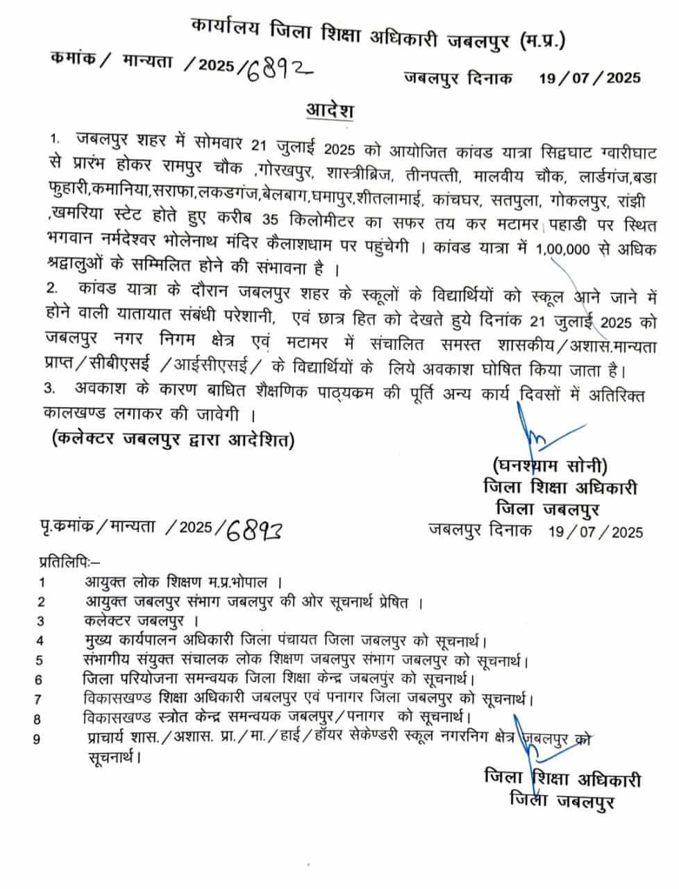 सावन माह में होने वाली कांवड़ यात्रा की भीड़ और छात्रों की सुरक्षा को देखते हुए मध्य प्रदेश, उत्तर प्रदेश और उत्तराखंड के कई जिलों के स्कूलों में अवकाश घोषित किया गया है। इसमें कई जिलों में स्कूल 23 जुलाई तक तो कहीं 2 अगस्त तक स्कूल बंद रहेंगे।हालांकि कुछ जिलों में हर सोमवार को स्कूल बंद रखने का फैसला लिया गया है।
