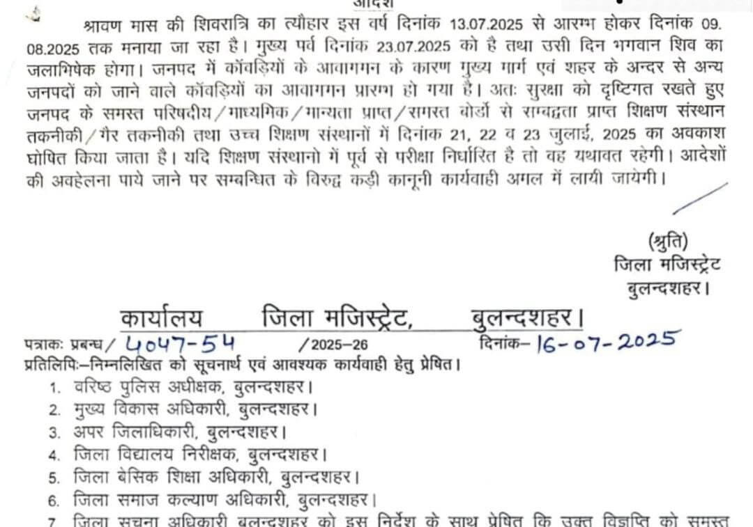 - बुलंदशहर में कांवड़ यात्रा को लेकर स्कूलों में 21, 22 व 23 जुलाई को अवकाश घोषित किया गया है।