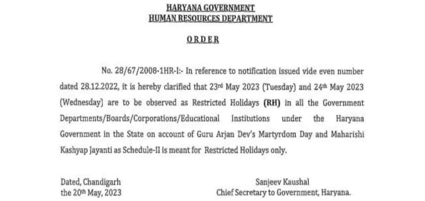 - मुख्य सचिव द्वारा जारी आदेशों में बताया गया है कि राज्य में अनुसूची-II प्रतिबंधित छुट्टियों की सूची के अनुसार गुरु अर्जुन देव जी के शहीदी दिवस और महर्षि कश्यप जयंती के कारण दोनों दिवसों को प्रतिबंधित अवकाश (RH) रहेगा।हरियाणा सिख गुरुद्वारा मैनेजमेंट कमेटी के सदस्यों ने राज्य सरकार के इस फैसले का स्वागत किया है।