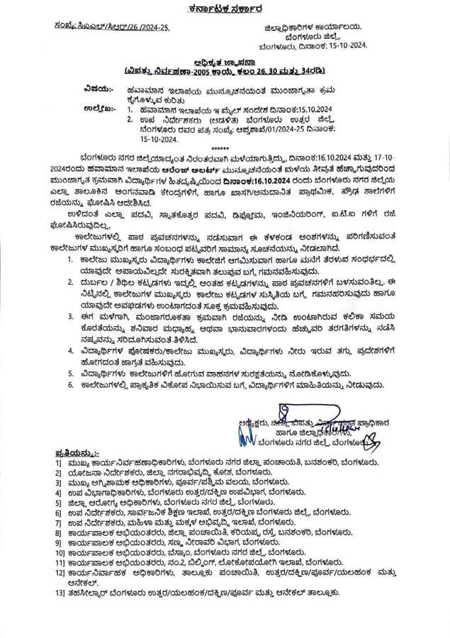 - भारी बारिश के पूर्वानुमान के कारण 16 अक्टबूर को बेंगलुरु शहरी जिला कलेक्टर जगदीश ने शहर के सभी आंगनवाड़ी केंद्र, सरकारी और निजी स्कूलों में छुट्टी का आदेश दिया है। चूंकि वाल्मीकि जयंती के अवसर पर सरकारी अवकाश है, इसलिए राज्य में 17 अक्तूबर को भी स्कूल बंद रहेंगे।