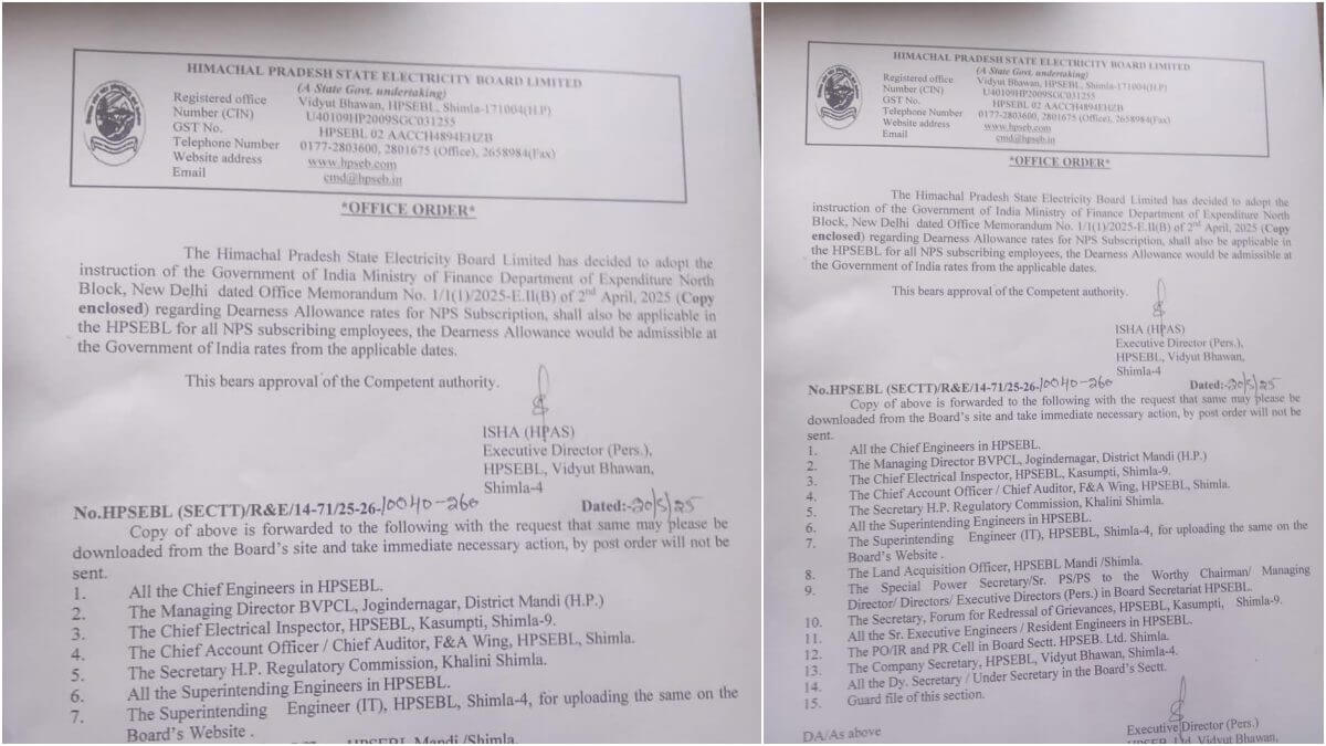 दरअसल, हिमाचल प्रदेश विद्युत बोर्ड लिमिटेड (HPSEBL) में कार्यरत एनपीएस (नया पेंशन योजना) के तहत आने वाले कर्मचारियों को अब केंद्र सरकार की तर्ज पर महंगाई भत्ता (DA) मिलेगा । बोर्ड के आदेश के मुताबिक, 2 फीसदी वृद्धि के बाद अब एनपीएस कर्मचारियों को 53%की जगह 55% डीए का लाभ मिलेगा। भविष्य में भी केंद्र सरकार जैसे ही एनपीएस कर्मचारियों को डीए में बढ़ोतरी करेगी, हिमाचल बिजली बोर्ड में भी वह स्वतः लागू हो जाएगी।