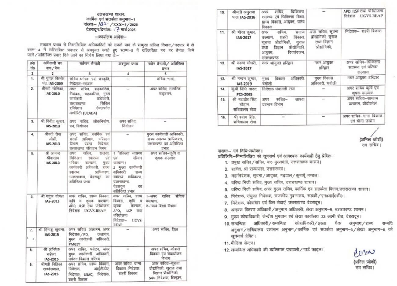 उत्तराखंड आईएएस विभाग बदलाव अतिरिक्त प्रभार