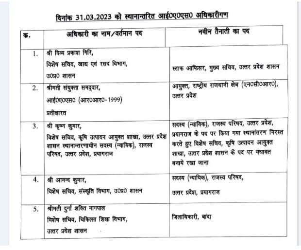 - श्मशाद हुसैन मुख्य राजस्व अधिकारी सुल्तानपुर से अपर आयुक्त मेरठ।