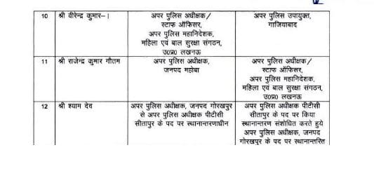 - श्याम देव – गोरखपुर से पीटीसी मुरादाबाद के लिए स्थानान्तरणाधीन – पीटीसी, सीतापुर के लिए तबादले को संशोधित करते हुए एएसपी गोरखपुर
