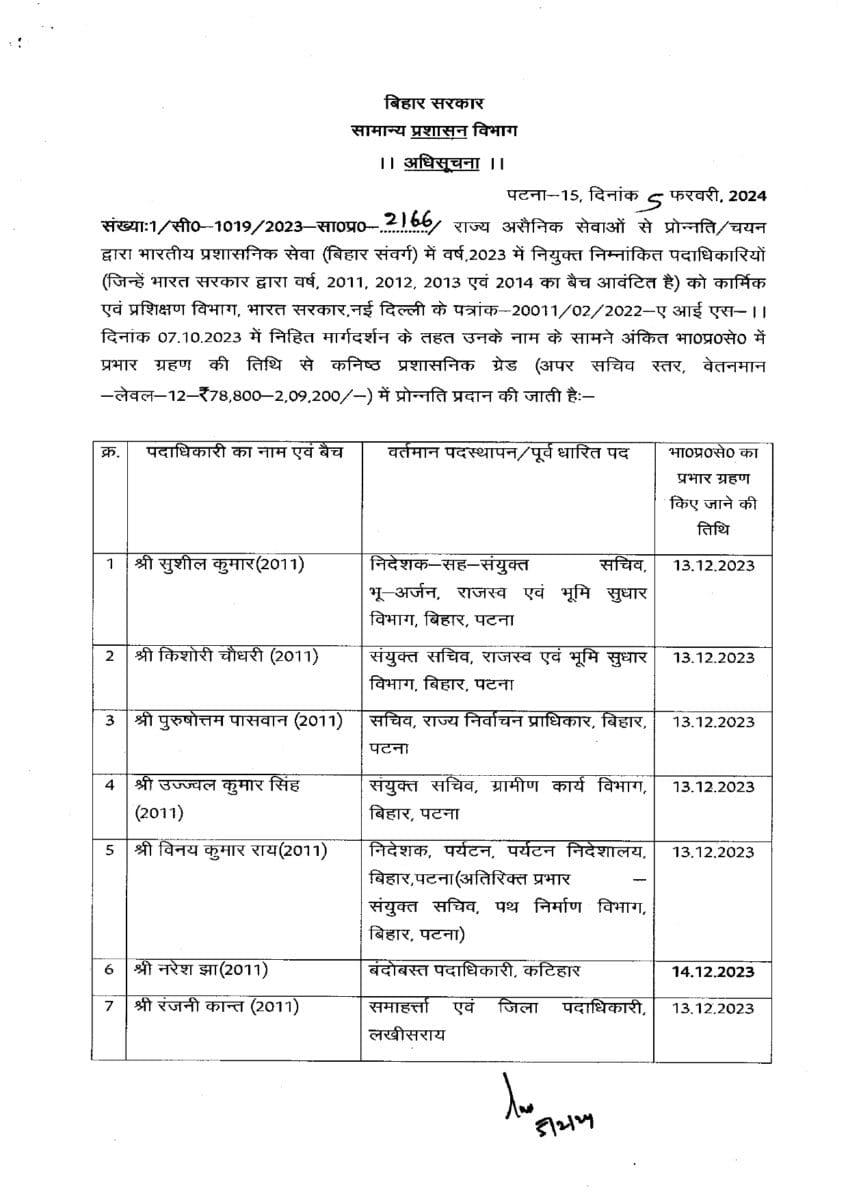 Bihar IAS Promotion 2024: आईपीएस-आईएएस तबादलों के बाद अब बिहार की नीतिश कुमार सरकार ने 55 आईएएस अफसरों को प्रमोशन का तोहफा दिया है। राज्य सरकार ने 2023 में भारतीय प्रशासनिक सेवा के अधिकारी में प्रोन्नति पाए 55 अधिकारियों को अवर सचिव स्तर में पदोन्नत किया गया है। इस संबंध में सामान्य प्रशासन विभाग ने अधिसूचना जारी कर दी है।यह सभी 2011, 2012, 2013 और 2014 बैच के आईएएस पदाधिकारी हैं।