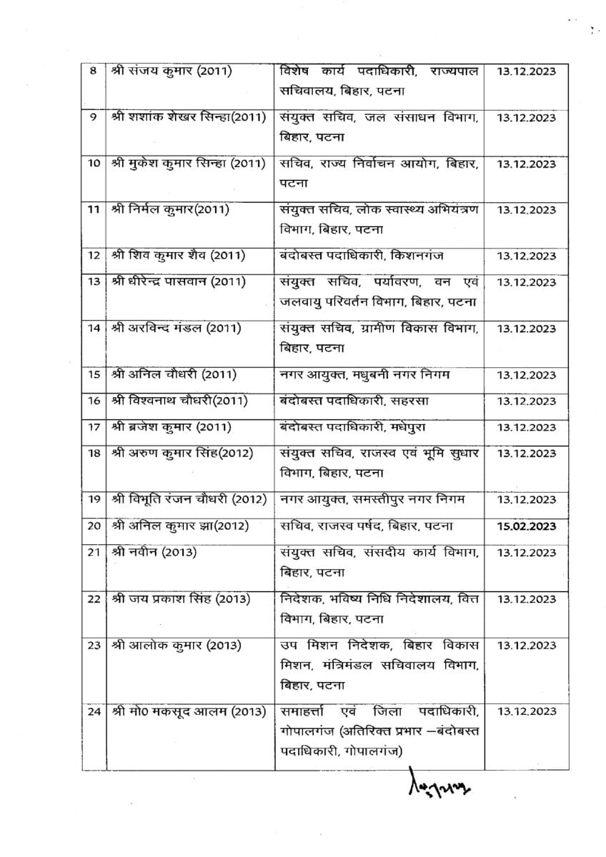 - पर्यावरण वन एवं जलवायु परिवर्तन विभाग के संयुक्त सचिव धीरेंद्र पासवान, ग्रामीण विकास विभाग के संयुक्त सचिव अरविंद मंडल, मधुबनी नगर निगम के नगर आयुक्त अनिल चौधरी, सहरसा के बंदोबस्त पदाधिकारी विश्वनाथ चौधरी और मधेपुरा के बंदोबस्त पदाधिकारी ब्रजेश कुमार ।