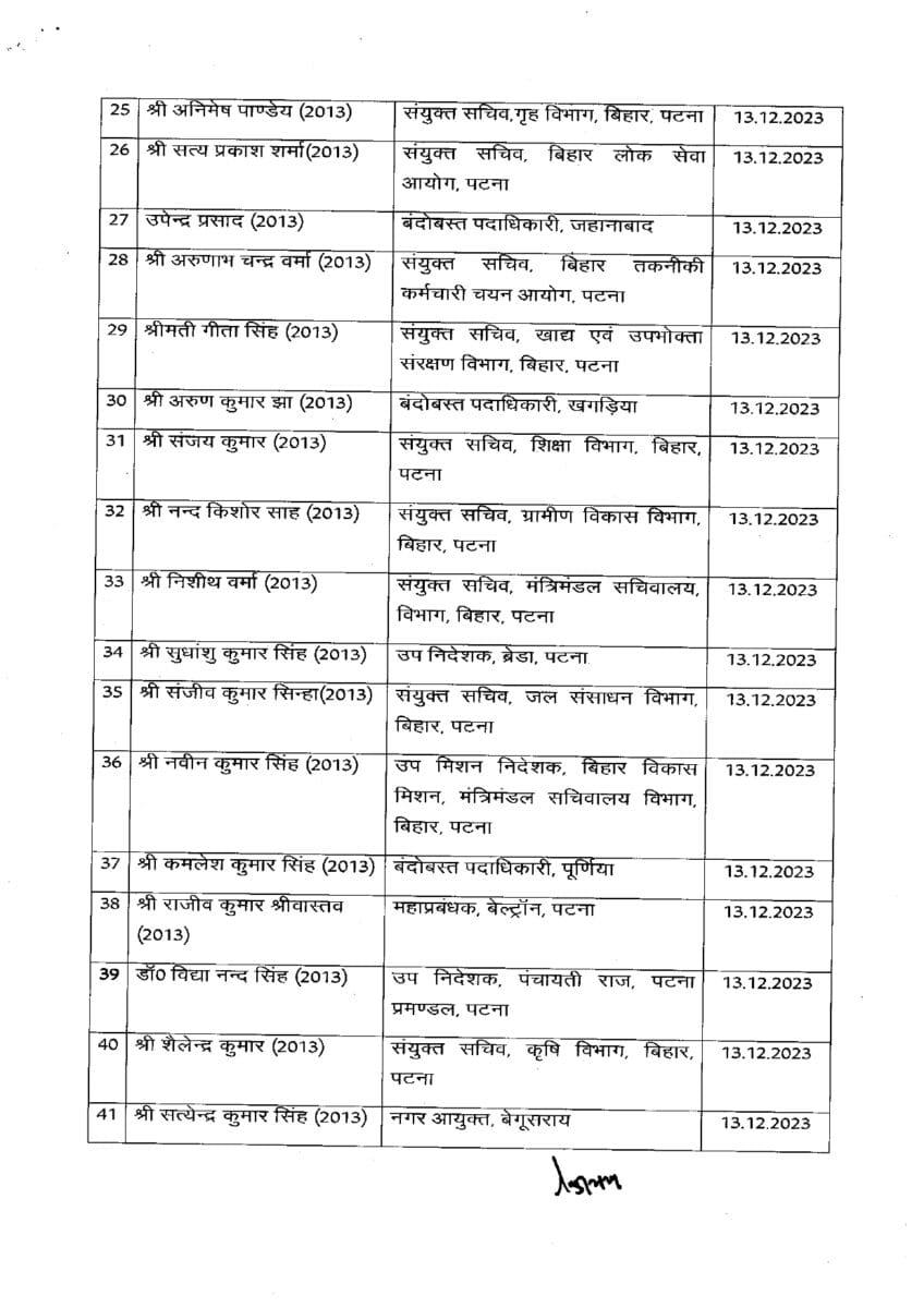 - खाद एवं उपभोक्ता संरक्षण विभाग के संयुक्त सचिव गीता सिंह, खगड़िया के बंदोबस्त पदाधिकारी अरुण कुमार झा, शिक्षा विभाग के संयुक्त सचिव संजय कुमार, ग्रामीण विकास विभाग के संयुक्त सचिव नंदकिशोर साह, मंत्रिमंडल सचिवालय के संयुक्त सचिव निशीथ वर्मा।