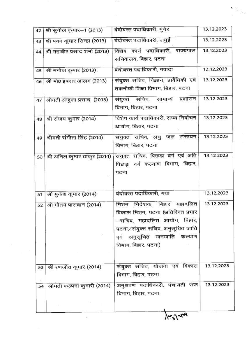 - बिहार विकास मिशन और मंत्रिमंडल सचिवालय के उपमिशन निदेशक आलोक कुमार, गिरी विभाग के संयुक्त सचिव अनिमेष पांडे, बिहार लोक सेवा आयोग के संयुक्त सचिव सत्य प्रकाश शर्मा, जहानाबाद के बंदोबस्त पदाधिकारी उपेंद्र प्रसाद, बिहार तकनीकी कर्मचारी चयन आयोग के संयुक्त सचिव अरुण चंद्र वर्मा।