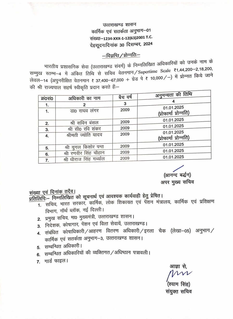 उत्तराखंड के राज्यपाल गुरमीत सिंह के आदेश पर भारतीय प्रशासनिक सेवा (उत्तराखंड संवर्ग) के कुल 7 अधिकारियों को सचिव वेतनमान/सुपरटाइम स्केल ₹1,44,200-2,18,200, लेवल-14 (अपुनरीक्षित वेतनमान ₹37,400-67,000 + ग्रेड पे ₹10,000/-) में प्रोन्नत करने की स्वीकृति प्रदान की गई है। प्रोन्नत IAS अधिकारियों को उनके नाम के सम्मुख अंकित तिथि से यह वेतनमान दिया जाएगा जो कि 1 जनवरी 2025 से लागू होगा।