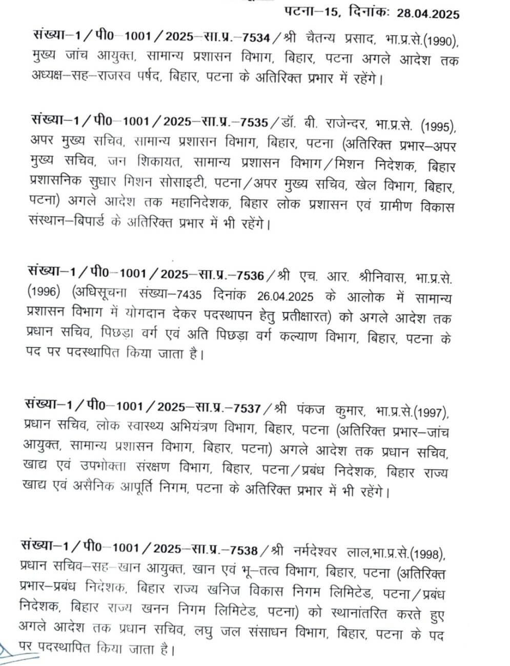 - चैतन्य प्रसाद को अगले आदेश तक अध्यक्ष-सह-राजस्व पर्षद, बिहार, पटना का अतिरिक्त प्रभार।