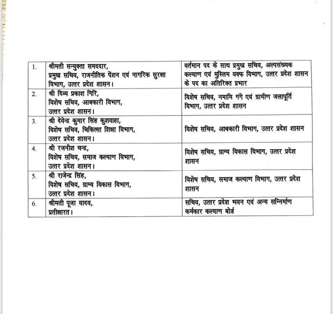 उत्तर प्रदेश की योगी आदित्यनाथ सरकार ने भी 6 आईएएस अधिकारियों को इधर से उधर किया है। प्रमुख सचिव, राजनीतिक पेंशन एवं नागरिक सुरक्षा संयुक्ता समद्दार को वर्तमान पद के साथ-साथ प्रमुख सचिव, अल्पसंख्यक कल्याण एवं मुस्लिम वक्फ का अतिरिक्त प्रभार भी दिया है। अब तक यह पद संभाल रहीं अपर मुख्य सचिव मोनिका एस गर्ग 30 अप्रैल को सेवानिवृत्त हो जाएंगी।