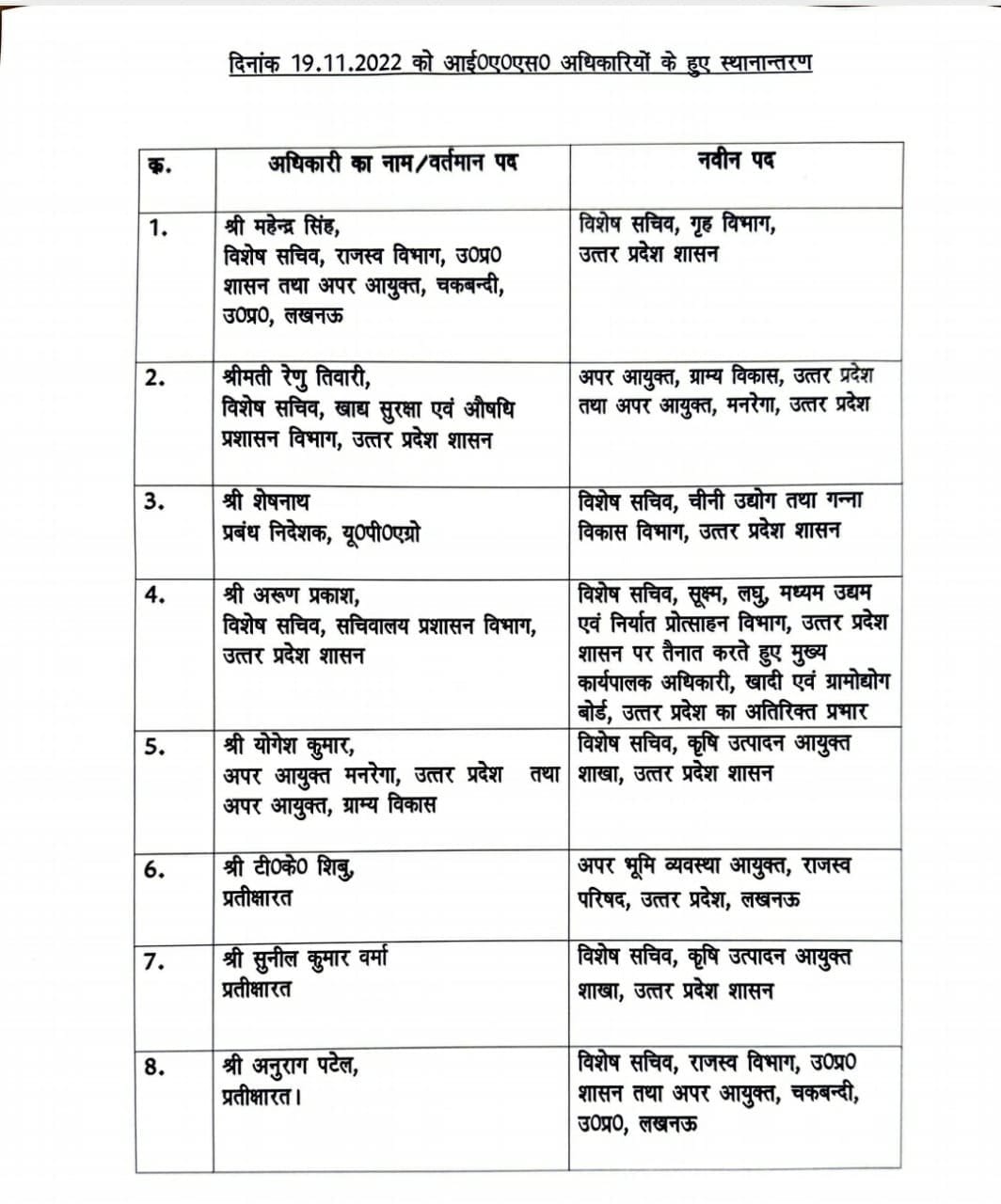 आईएएस अधिकारी शेषनाथ को चीनी उद्योग तथा गन्ना विकास विभाग में विकास सचिव के पद पर तैनात किया गया है। IAS अरुण प्रकाश को सूक्ष्म लघु मध्यम उद्यम और निर्यात प्रोत्साहन विभाग में विकास सचिव के पद पर नवीन पदस्थापना सौंपी गई है।
