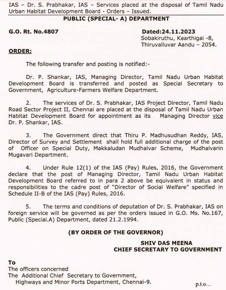 - श्री. पी. मधुसूदन रेड्डी, आईएएस, सर्वेक्षण एवं निपटान निदेशक, विशेष कर्तव्य अधिकारी (ओएसडी), ‘मक्कलुडन मुधलवार’ योजना, मुधलवारिन मुगावरी विभाग के पद का अतिरिक्त प्रभार संभालेंगे।