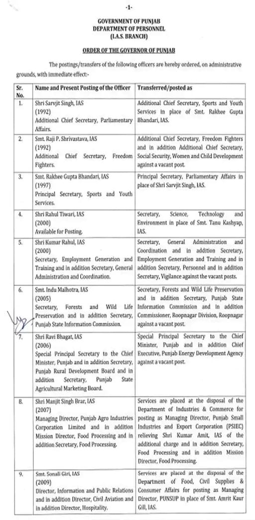 - जबकि कुमार अमित को विशेष प्रमुख सचिव, मुख्यमंत्री के साथ पंजाब एग्रो का भी एमडी नियुक्त किया गया है।