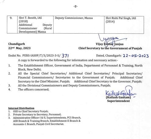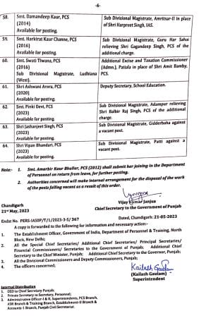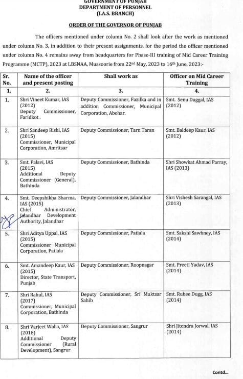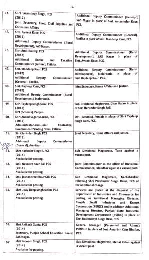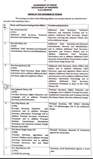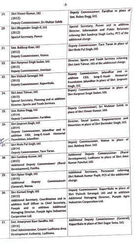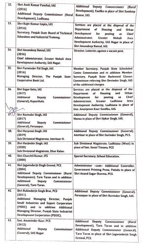 पंजाब में 7 उपायुक्त सहित 39 आईएएस अधिकारियों को इधर से उधर किया गया है। फेरबदल में सभी को नवीन पदस्थापना सौंपी गई है। तत्काल प्रभाव से सभी को पदभार ग्रहण करना होगा। 21 मई को फेरबदल के साथ ही 22 मई को एक दूसरी सूची जारी की गई है। जिसमें 10 नए आईएएस अधिकारियों को नवीन पदस्थापना सौंपी गई है।