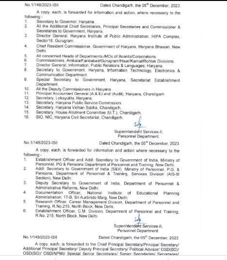आदेश के तहत 2021 बैच के 7 आईएएस अधिकारियों को SDO के पद पर नियुक्त किया है।वही 2011 बैच के आईएएस लक्षित सरीन को अंबाला कैंट में एसडीओ और स्टेट ऑफिसर की जिम्मेदारी दी गई है, यह पद एचसीएस सतिंदर सिवाज के छुट्टी पर जाने से खाली चल रहा था। आईएएस नरेंद्र कुमार को पलवल जिले में एसडीओ बनाया गया है जो 2016 बैच के एचसीएस शशि के जाने के बाद खाली चल रहा था। इसके अलावा रोहतक के सब डिविजनल ऑफिसर HCS (2016 ) राकेश सैनी को ज्वाइंट कमिश्नर का पदभार दिया गया है।