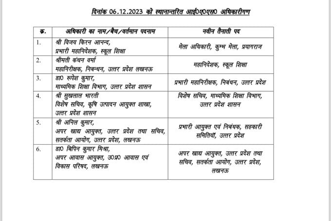 - अपर आवास आयुक्त आवास विकास परिषद उप्र डा. विपिन कुमार मिश्रा अपर खाद्य आयुक्त उत्तर प्रदेश और सचिव सतर्कता आयोग का पद दिया गया है।