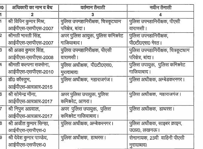 - महाराजगंज में सोमेंद्र मीना को एसपी के रूप में तैनाती मिली है। वहीं, निपुण अग्रवाल को हाथरस जिले की कमान दी गई है।