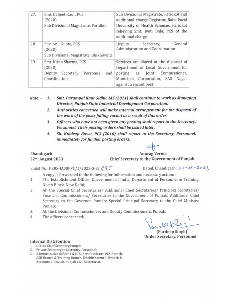 - बलदेव कौर को स्पेशल सेक्रेटरी कार्मिक विभाग में पद स्थापना सोप गई है।