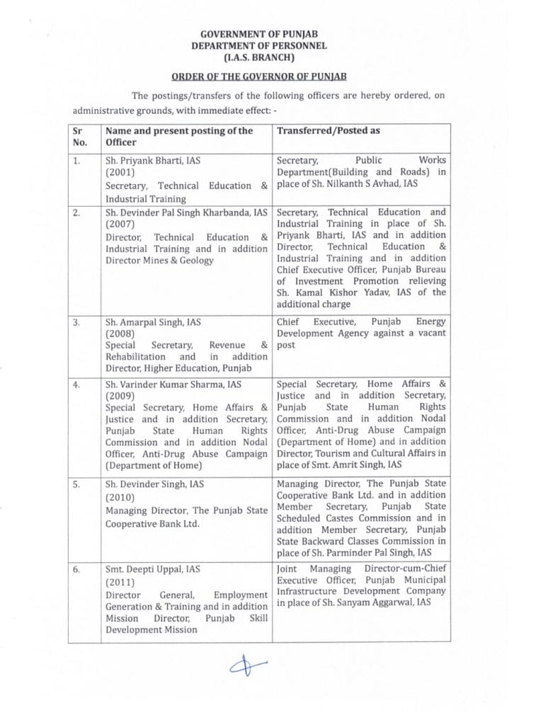 - देविंदर पाल सिंह को सचिव टेक्निकल एजुकेशन और इंडस्ट्रियल ट्रेनिंग और एजुकेशन के साथ विभाग के डायरेक्टर पद की अतिरिक्त जिम्मेदारी सौंपी गई है।
