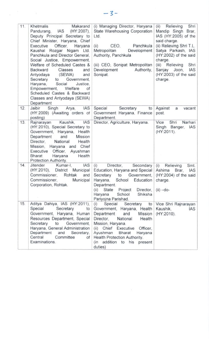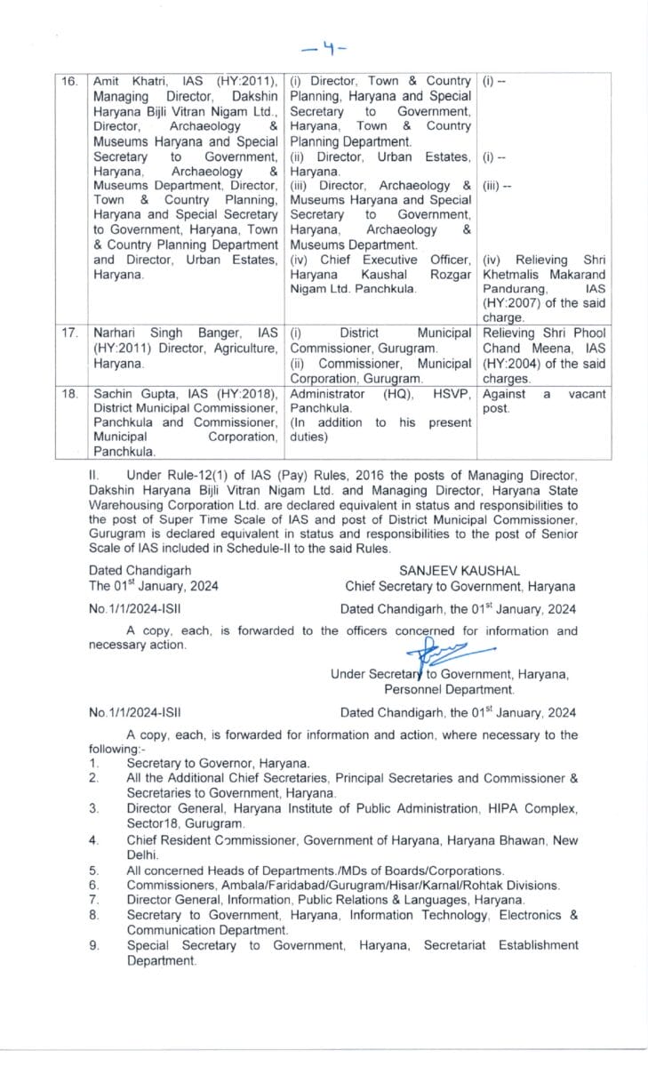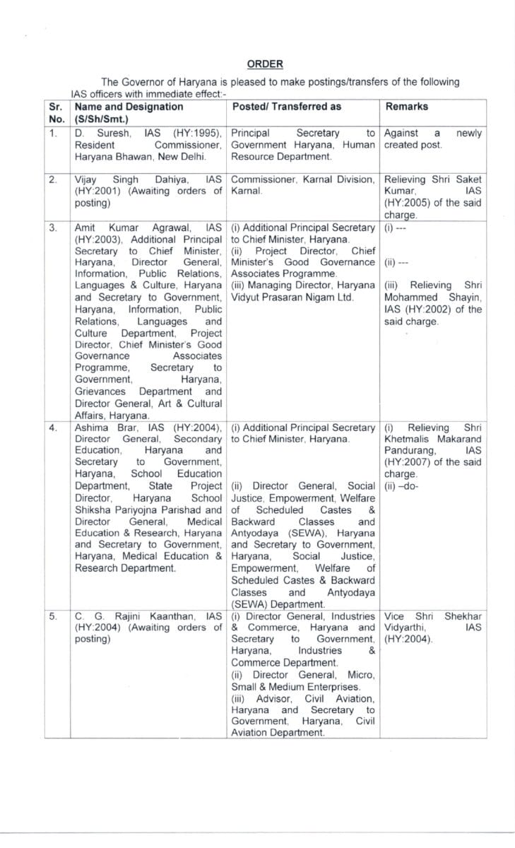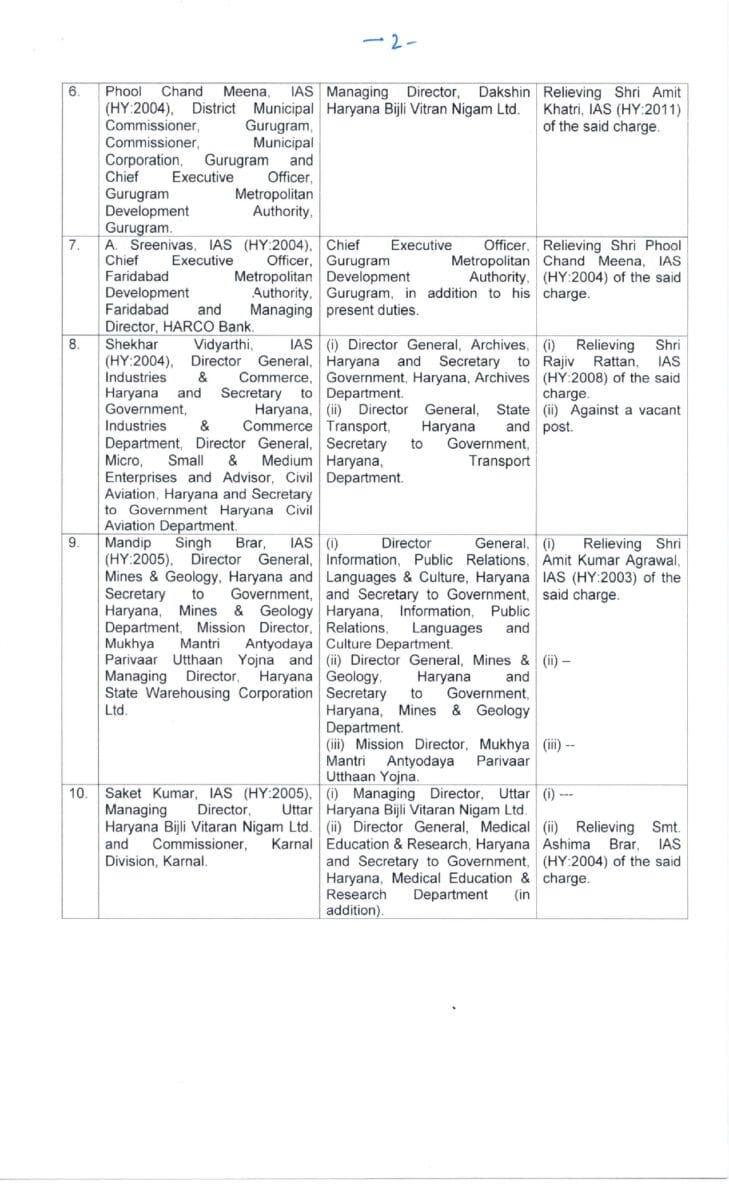 आईएएस अधिकारी मनदीप सिंह बराड़ को डायरेक्टर जनरल इनफार्मेशन पब्लिक रिलेशन । - आईएएस अधिकारी साकेत कुमार को उत्तर हरियाणा बिजली वितरण निगम का मैनेजिंग डायरेक्टर ।