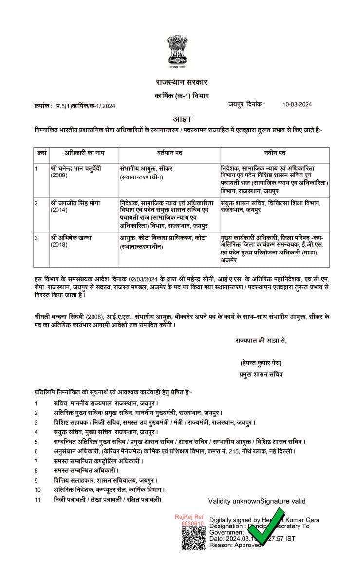 कार्मिक विभाग द्वारा जारी आदेश के तहत, घनेन्द्र भान चतुर्वेदी (2009) को निदेशक, सामाजिक न्याय एवं अधिकारिता विभाग एवं पदेन विशिष्ट शासन सचिव एवं पंचायती राज (सामाजिक न्याय एवं अधिकारिता) विभाग, राजस्थान, जयपुर भेजा गया है। जगजीत सिंह मोंगा (2014) का संयुक्त शासन सचिव, चिकित्सा शिक्षा विभाग, राजस्थान, जयपुर की जिम्मेदारी दी गई है जबकि IAS अभिषेक खन्ना (2018) को मुख्य कार्यकारी अधिकारी, जिला परिषद्-कम- अतिरिक्त जिला कार्यक्रम समन्वयक, ई जी एस. एवं पदेन मुख्य परियोजना अधिकारी (माडा), अजमेर में भेजा गया है।