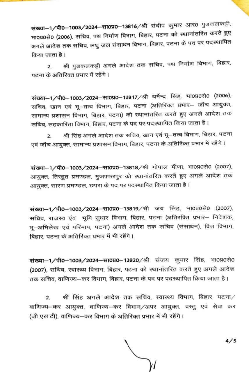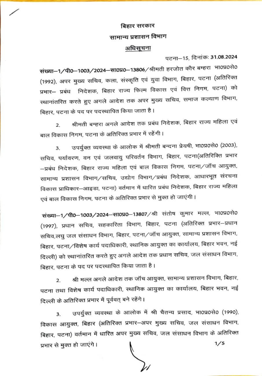 Bihar IAS Transfer: बिहार में एक बार फिर बड़ा प्रशासनिक फेरबदल किया गया है। शनिवार देर रात राज्य की नीतिश कुमार सरकार ने 16 आईएएस अधिकारियों का ट्रांसफर किया गया है।इसमें मगध, सारण और तिरहुत प्रमंडल में नए आयुक्तों की नियुक्ति की गई है।सामान्य प्रशासन विभाग ने इसकी अधिसूचना जारी कर दी है।