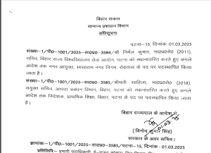 बैच 2011 के आईएएस अफसर निर्मल कुमार को स्थानांतरित करते हुए सासाराम नगर निगम, रोहतास के नगर आयुक्त के पद पर नियुक्त किया गया है। इससे पहले वह बिहार राज्य विश्वविद्यालय सेवा आयोग के सचिव पद पर कार्यरत थे। आपदा प्रबंधन विभाग संयुक्त सचिव पद की जिम्मेदारी संभाल रहे बैच 2018 की आईएएस ऑफिसर साहिला को स्थानंतरित किया गया है, उन्हें प्राथमिक शिक्षा बिहार के निदेशक पद की जिम्मेदारी सौंपी गई है।