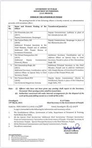 आईएएस और पीसीएस अधिकारियों के तबादले और नियुक्ति को लेकर राज्यपाल के आदेश पर कार्मिक विभाग ने नोटिस जारी किया है। जिसके तहत दो जिलों के डिप्टी कमिश्नर बदले गए हैं। पीसीएस अधिकारी तरसेम चंद को को उदयदीप सिंह सिद्धू के स्थान पर आबकारी आयुक्त (आबकारी एवं डिस्टिलरीज) पटियाला के पद पर नियुक्त किया गया है। इससे पहले वह विभागीय मजिस्ट्रेट समाना के पद पर कार्यरत थे।