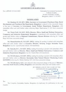 कर्नाटक में नौकरशाही फेरबदल देखने को मिला है मुख्यमंत्री सिद्धारमैया की सरकार ने एक साथ पांच भारतीय प्रशासनिक सेवा अधिकारियों का स्थानांतरण (IAS Transfer) किया है। ग्रामीण विकास एवं पंचायत राज विभाग सचिव समेत कई विभागों के निदेशक बदले गए हैं। दो आईएएस अफसरों को अतिरिक्त प्रभार सौंपा गया है। 13 अक्टूबर सोमवार को राज्यपाल के आदेश और नाम पर सरकार ने राज्य सरकार ने तबादले और नियुक्ति से संबंधित आदेश जारी कर दिया है।