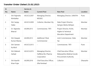 महाराष्ट्र में एक बार फिर सीएम देवेंद्र फडणवीस की सरकार ने प्रशासनिक फेरबदल किया है। एक साथ भारतीय प्रशासनिक सेवा के साथ अफसरों को स्थानांतरण हुआ है। आईएएस अधिकारियों को नए पद की जिम्मेदारी सौंप गई है। दो जिलों के कलेक्टर भी बदले गए हैं। तबादले और नियुक्ति का सरकार ने (IAS Transfer 2025 Order) आदेश जारी कर दिया। अधिकारियों को नया प्रभार संभालने का निर्देश दिया गया है।