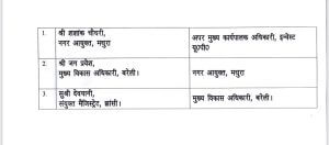 मथुरा नगर आयुक्त पद पर जग प्रवेश को पदस्थ किया गया है, जो पहले बरेली के मुख्य विकास अधिकारी पद की जिम्मेदारी संभाल रहे थे। वहीं मथुरा नगर आयुक्त पद पर कार्यरत शशांक चौधरी को अपर मुख्य कार्यपालं अधिकारी, इन्वेस्ट यूपी पद पर नियुक्त किया गया है।