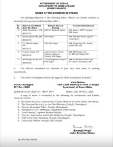 आईपीएस अफसर अखिल चौधरी, एसएसपी श्री मुक्तसार साहिब को एआईजी, प्रशासन एएनटीएफ, एसएएस नगर पद पर पदस्थ किया गया है। सुहैल कासिम मीर एसएसपी बटाला को एसएसपी अमृतसर ग्रामीण पद पर भेजा गया है। डॉ महताब सिंह एसएसपी एसबीएस नगर को एसएसपी बटाला पद पर पद पर भेजा गया है। तुषार गुप्ता, संयुक्त निदेशक, अपराध, सतर्कता ब्यूरो पंजाब एसएएस नगर को एसएसपी एसबीएस नगर पद पर पदस्थ किया गया है। वहींअभिमन्यु राणा को एसएसपी श्री मुक्तसर साहिब पद पर भेजा गया है, जो पहले एआईजी, इंटेलिजेंस पंजाब एसएएस नगर पद पर कार्यरत थे।