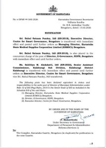 आईएएस अधिकारी राहुल रत्नम पांडे, एग्जीक्यूटिव डायरेक्टर, सेंटर फॉर स्मार्ट गवर्नेंस बेंगलुरु को स्थानांतरित करके प्रबंध निदेशक कर्नाटक स्टेट मेडिकल सप्लाई कॉर्पोरेशन लिमिटेड बेंगलुरु पद पर तैनात किया गया है। इसके अलावा वह आरडीपीआर बेंगलुरु में ई-गवर्नेंस के डायरेक्टर पद का कार्यभार भी संभालेंगे। साहित्य एवं अलादकट्टी, सीनियर असिस्टेंट कमिश्नर, कुलबर्गी सब-डिवीजन को एग्जीक्यूटिव डायरेक्टर, सेंटर फॉर स्मार्ट गवर्नेंस बेंगलुरु पद की जिम्मेदारी सौंपी गई है।