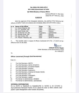 24 फरवरी को गृह मंत्रालय द्वारा जारी आदेश के तहत AGMUT कैडर के 7 आईएएस अधिकारियों का तबादला हुआ है। आईएएस अधिकारी सुनील सिंह और रंजीत सिंह को स्थानंतरित करके दिल्ली से मिजोरम में पदस्थ किया गया है। पुडुचेरी में कार्यरत शिवकुमार ए.एस को लक्षद्वीप में पोस्टिंग दी गई है। प्रांजल के.हजारिका को जम्मू कश्मीर में पदस्थ किया गया है। के.सी सुरेंद्र को दिल्ली से पुडुचेरी और अजय कुमार को दिल्ली से डीएनएच एंड डीडी में पदस्थ किया गया है। डॉ श्रवण बागड़िया को स्थानांतरित करके दिल्ली से गोवा में पदस्थित किया गया है।