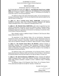 - रश्मिता पांडा को भुवनेश्वर विकास प्राधिकरण की उपाध्यक्ष और भुवनेश्वर स्मार्ट सिटी लिमिटेड के प्रबंध निदेशक के साथ-साथ आवास एवं शहरी विकास विभाग के विशेष सचिव और सूक्ष्म, लघु और मध्यम उद्यम विभाग का आयुक्त-सह-सचिव बनाया गया है। स्टार्ट अप ओडिशा के एक्जीक्यूटिव ऑफिसर और ओआरएसएसी के सीईओ पद का अतिरिक्त प्रभार भी सौंपा गया है।