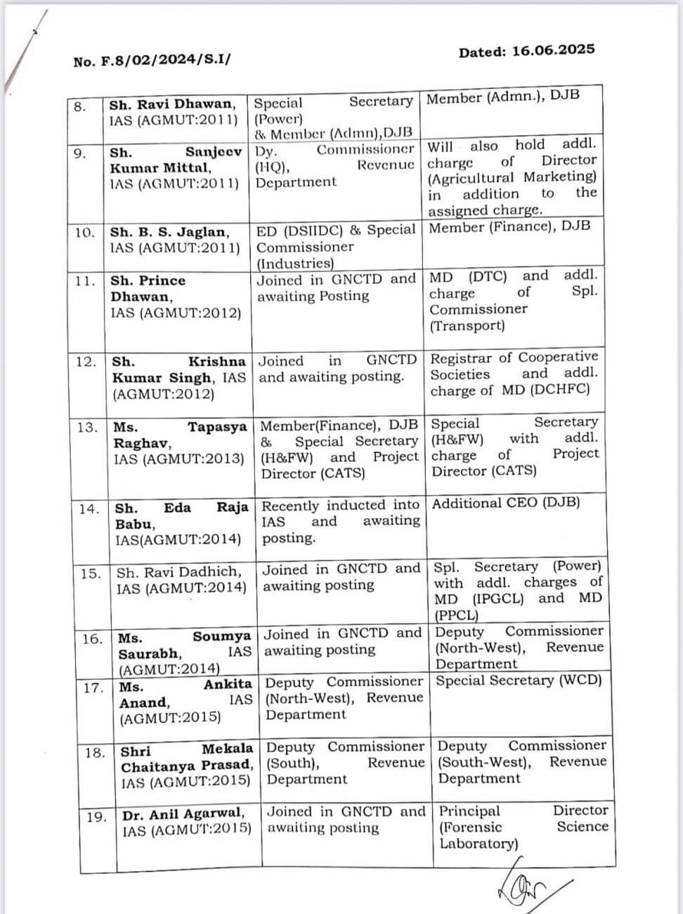 - प्रिंस धवन को (परिवहन) एमडी (डीटीसी) एवं अतिरिक्त प्रभार आयुक्त विशेष, कृष्ण कुमार सिंह को सहकारी समितियों के रजिस्ट्रार और एमडी (डीसीएचएफसी) का अतिरिक्त प्रभार, रवि दाधीच को विशेष सचिव (विद्युत) के साथ दूसरे अतिरिक्त प्रभार, ,तपस्या राघव को स्वास्थ्य विभाग में विशेष सचिव के साथ परियोजना निदेशक (सीएटीएस) का अतिरिक्त प्रभार दिया गया है।