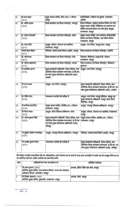 राजस्थान में बड़े पैमाने पर प्रशासनिक फेरबदल किया गया है।रविवार देर रात राज्य की भजनलाल सरकार ने 62 आईएएस अधिकारियों के तबादले किए है। इसमें 6 जिलों कलेक्टर बदले गए हैं। 21 आईएएस अधिकारियों को अतिरिक्त प्रभार भी सौंपा गया है।इस संबंध में कार्मिक विभाग की ओर से सूची जारी कर दी गई है।