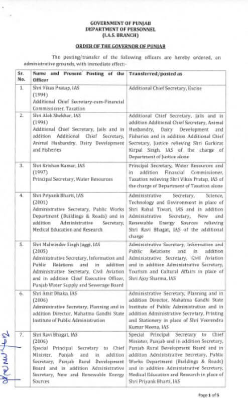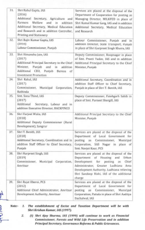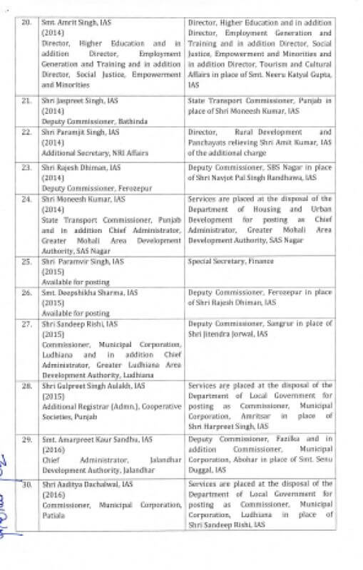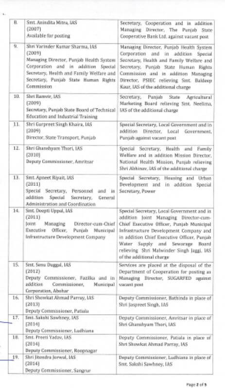 प्रीति यादव को पटियाला का उपायुक्त ,जितेंद्र जोरवाल को लुधियाना का उपायुक्त , दीपशिखा शर्मा को फिरोजपुर का उपायुक्त ,राजेश धीमान को एसबीएस नगर का उपायुक्त , संदीप ऋषि को संगरूर बनाया गया है और अमरप्रीत कौर सिद्धू को फाजिल्का के उपायुक्त का कार्यभार सौंपा गया है।वरिष्ठ आईएएस अधिकारी अनिंदिता मित्रा को सचिव, सहकारिता के पद पर नियुक्त किया गया है।